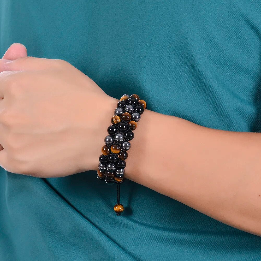Les perles en Œil de Tigre apportent courage et protection, tandis que l'hématite favorise la stabilité émotionnelle et l'onyx noir offre une barrière contre les énergies négatives. Ensemble, ces pierres naturelles créent une aura de confiance et de sécurité.