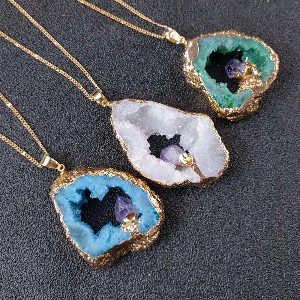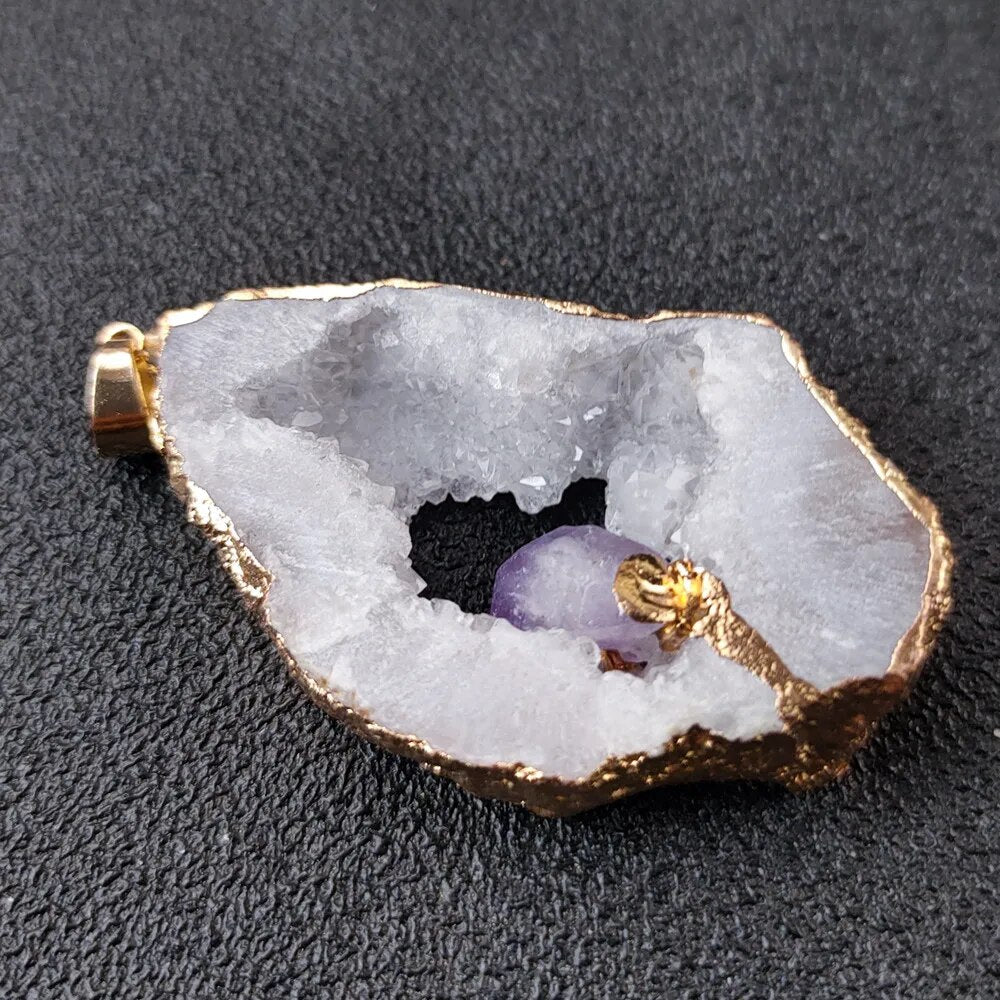 Pendentif en Tranche de Géode d'Agate Naturelle, Bordure Plaqué Or Incrustée d'Améthyste, Collier Creux Irrégulier Élégant pour Femmes